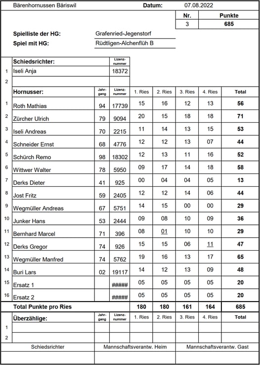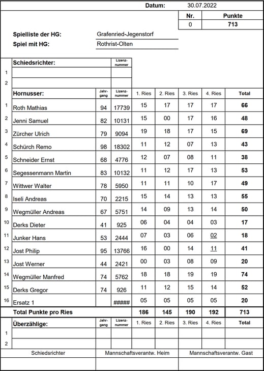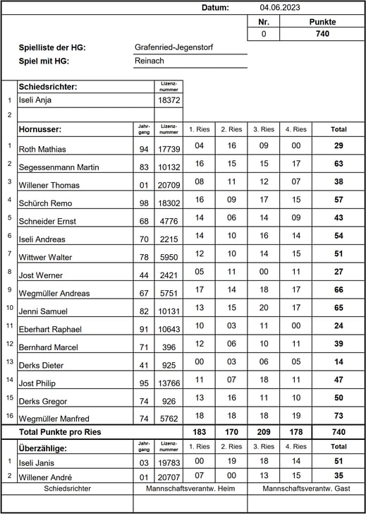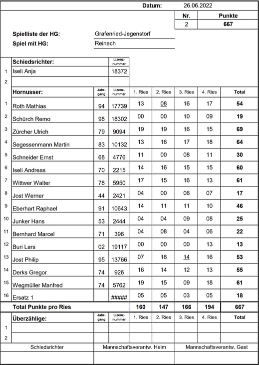 Im zweiten Umgang konnten wir unsere Schlagpunkte etwas verbessern. Da die Reinacher aber noch die Möglichkeit hatten sich zu verbessern wurde es erneut spannend. Doch da wir das Ries wieder erfolgreich verteidigen konnten und die Punkteführung beibehielten entschieden wir das Spiel für uns. Besonders hervorzuheben ist die Leistung unseres Topschlägers Wegmüller Manfred, der mit 73 Punkten glänzte und massgeblich zu unserer Punkteführung beitrug. Ein Sieg, der uns wichtige 4 Rangpunkte in der Meisterschaft einbrachte. Endstand: 0/721 HGR zu 0/740 HGGJ