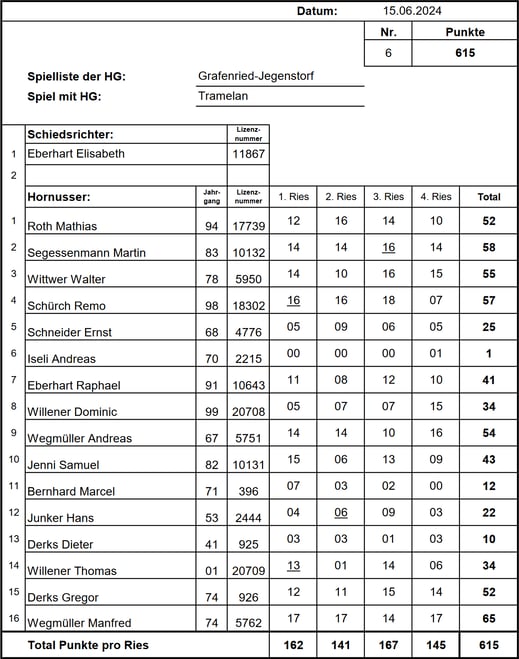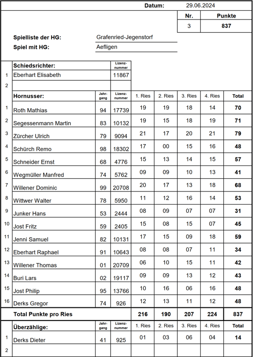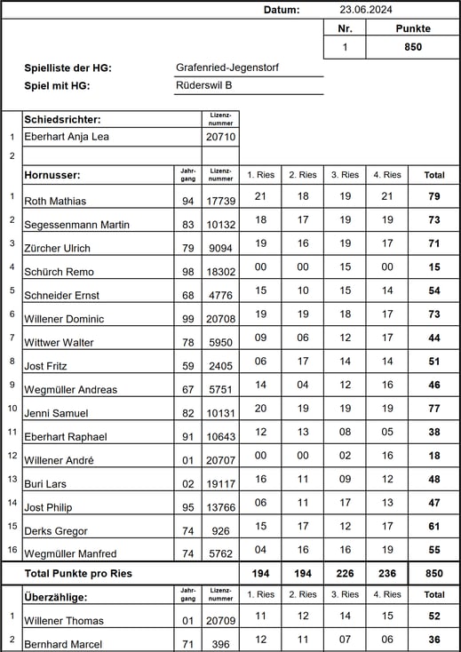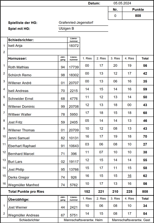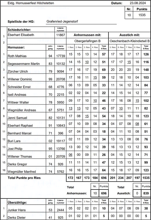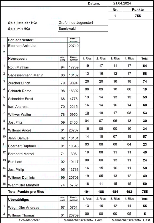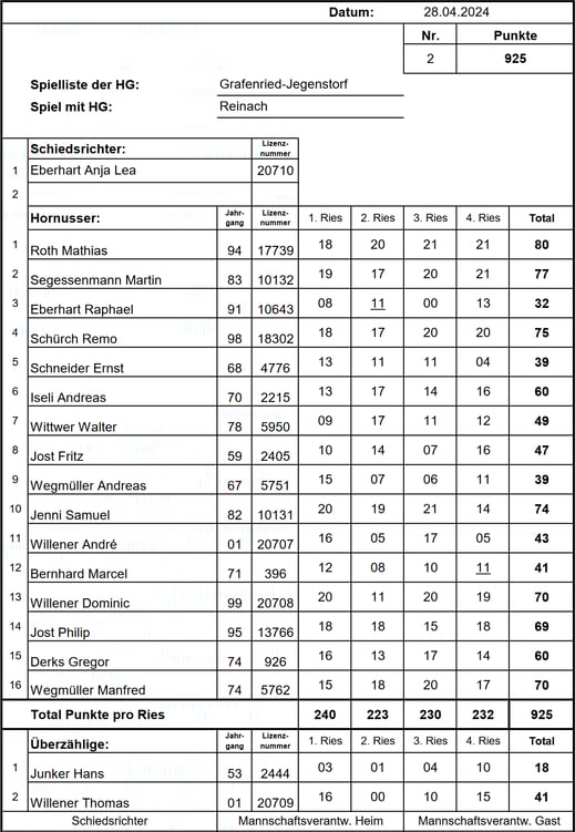 Im zweiten Umgang mussten wir erneut ein Nummero schreiben. Die Nummeros waren heute kaum zu halten. Und so können wir mit gutem Gewissen sagen, dass wir eine solide Leistung im Ries gezeigt haben. Unsere Schlagleistung war erneut beeindruckend, mit 230 Punkten im dritten und 232 im vierten Ries. Wir mussten lange zittern doch schliesslich enttschied ein weiteres Nummero für den Gegner das Spiel für uns und sicherte uns den zweiten Sieg. Endstand: 2/614 HGR zu 2/925 HGGJ.